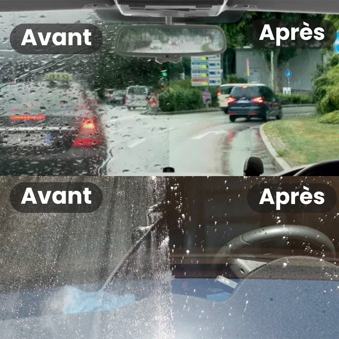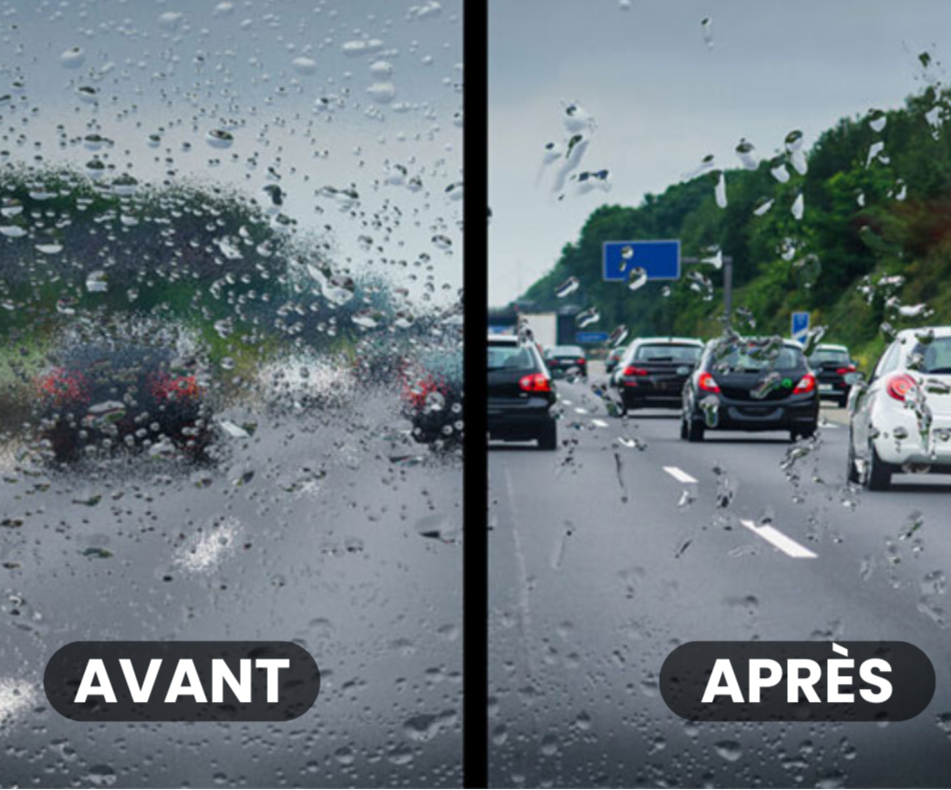 Notre solution hydrophobe forme une couche protectrice durable sur les vitres de votre voiture.